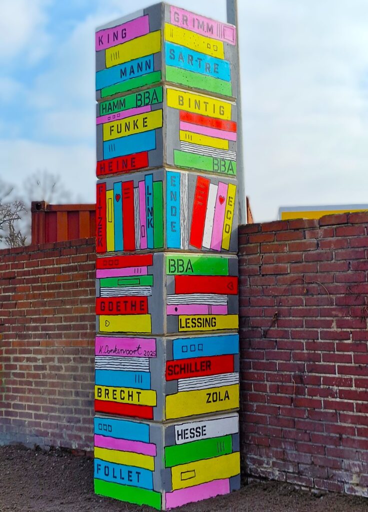 Das Wandbausteinsystem „Twinblock“ der Firma BBA aus Bockum-Hövel ist ein Recyclingprodukt, das eigentlich für Trenn- und Anschubwände, Stützmauern usw. eingesetzt wird. Hier wird es zur Skulptur mit denkwürdigem Inhalt. In der STRECKEN-Bücherei befindet sich Literatur bekannter internationaler aber auch regionaler SchriftstellerInnen. Wie immer bei Kerstin Donkervoort mit kraftvollen Farben, setzt die Skulptur ein Highlight an der Ecke Römerstraße /Erlenfeldstraße.